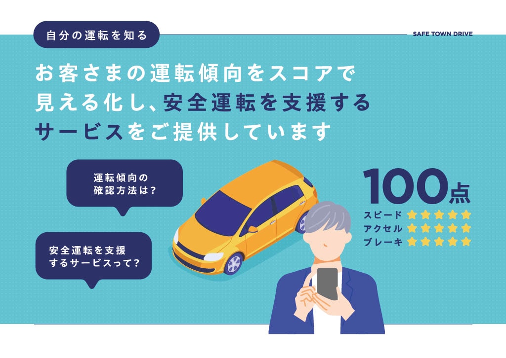 安全運転の度合いをスコアで評価する仕組み。安全運転スコアは、「速度超過・急アクセル・急ブレーキ」の発生頻度をもとに算定されます。自分の運転の特徴を振り返り、安全運転につなげることができます。