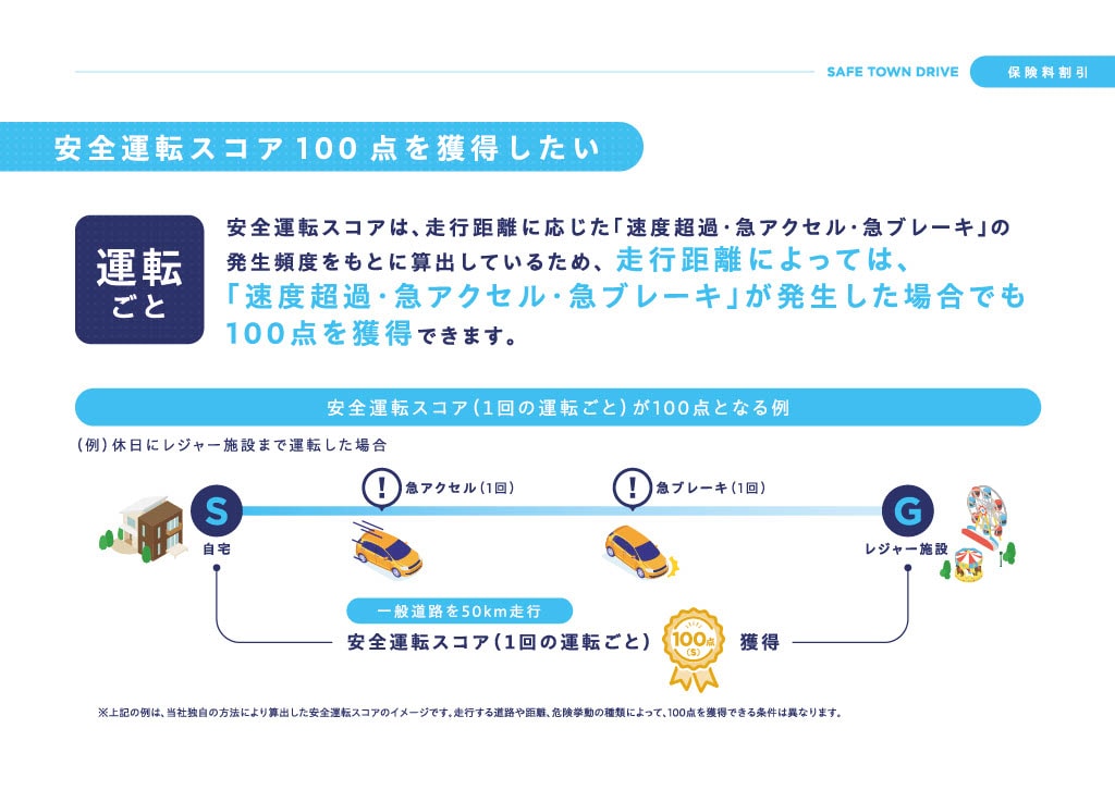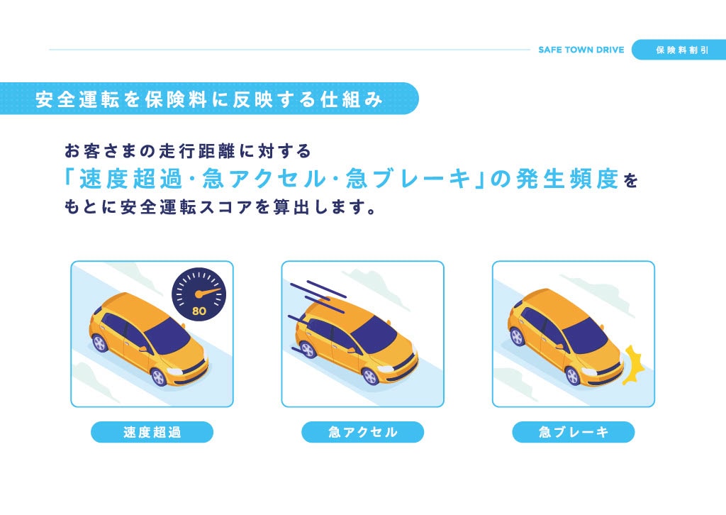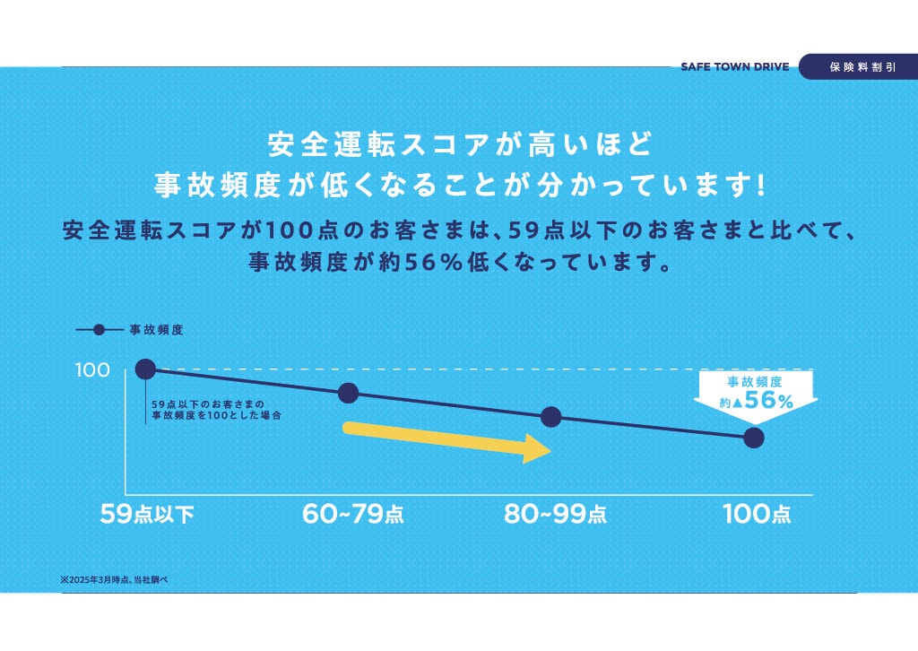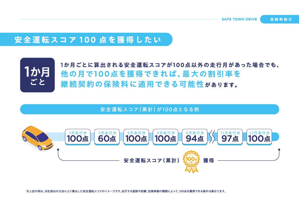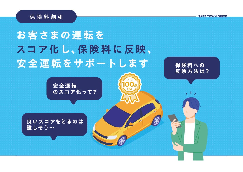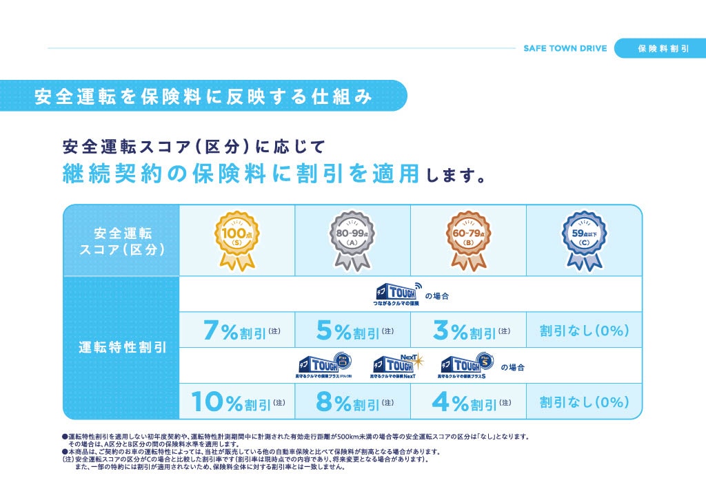 お客さまの走行データから安全運転スコアが算定され、そのスコアに応じ、継続契約の保険料から最大10%の割引が適用されます。