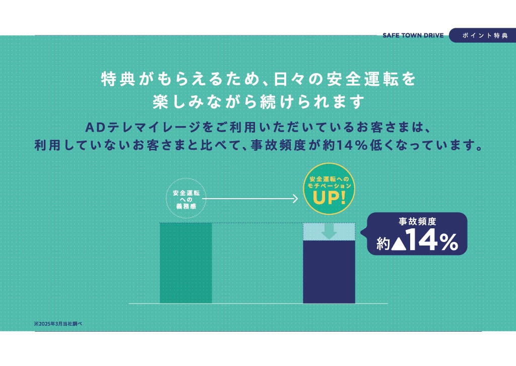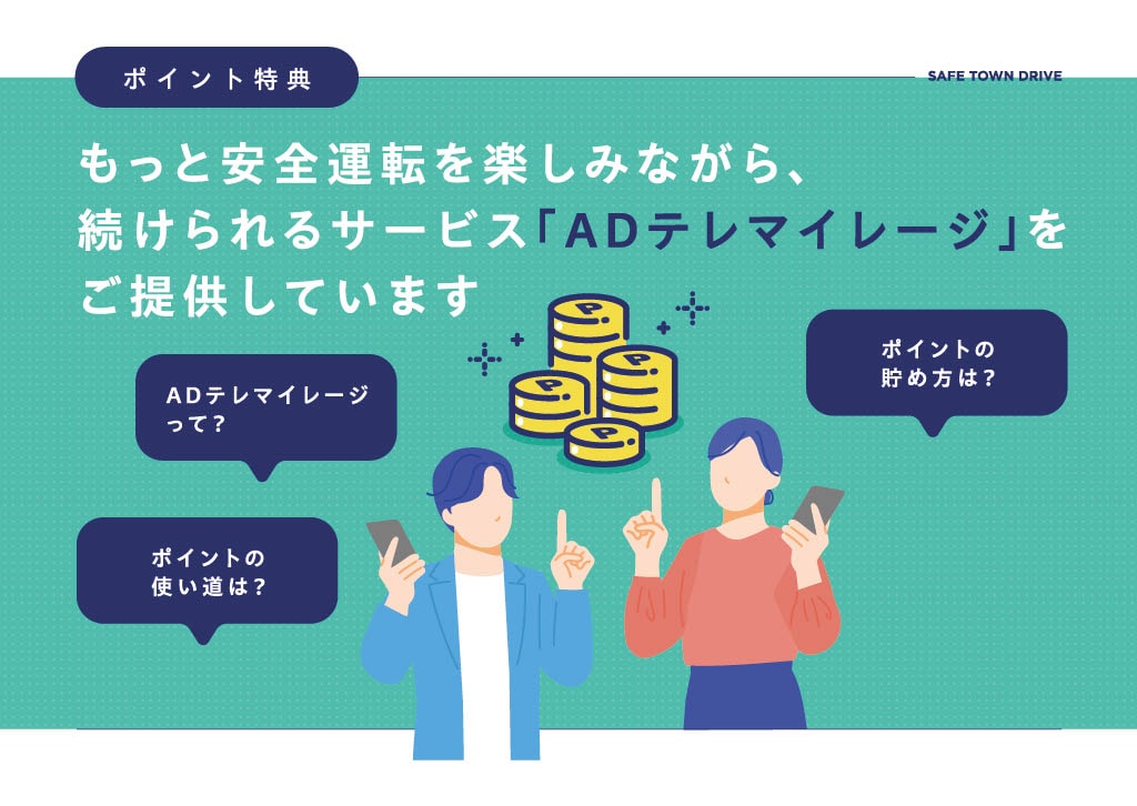お客さま一人ひとりが、楽しみながら日々の安全運転に取り組んでいただけるポイントプログラムとして「ADテレマイレージ」をご提供しています。