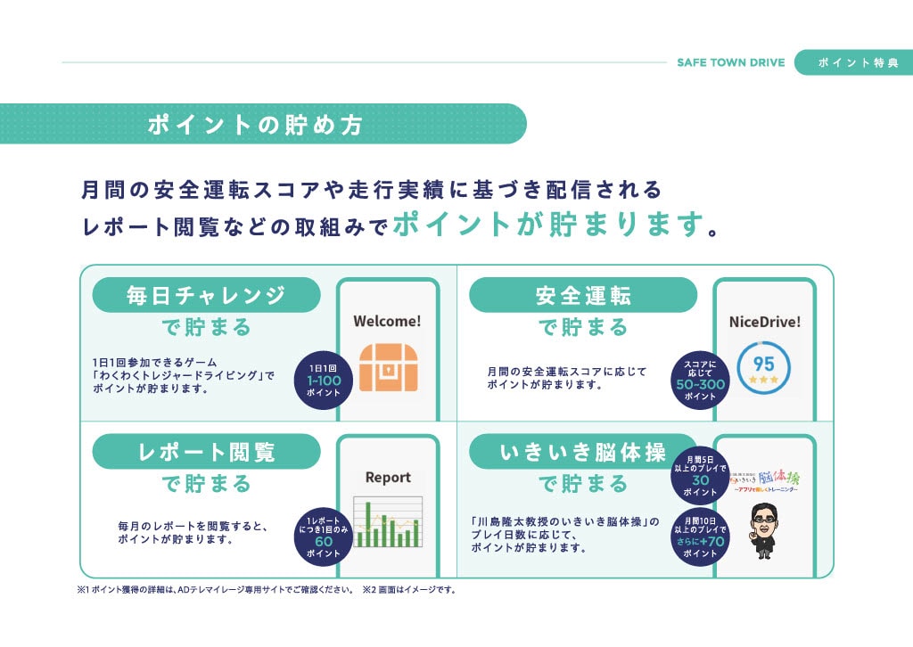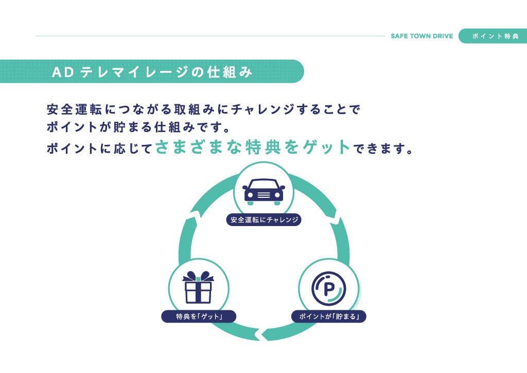 ADテレマイレージは、安全運転につながる取組みにチャレンジすることでポイントが貯まる仕組みです。